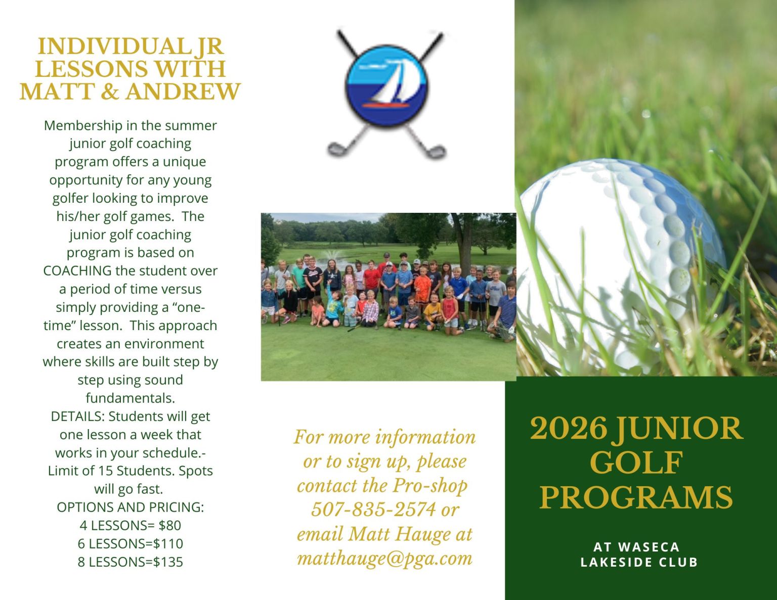 We have a number of great ways for youngsters to start mastering the classic game of golf. For more information about junior golf at Waseca Lakeside Club, please call (507) 835-2574.
